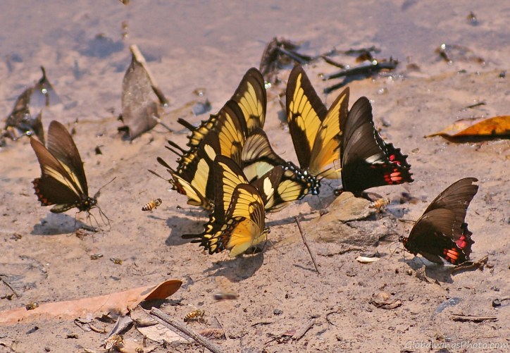 The three yellow swallowtails photographed at the Cristalino Jungle Lodge, Alta Floresta. They are clockwise from the left: Broad-banded (1), Torquatus (1), unidentified (2), and Androgeus (1) Swallowtails plus Ruby-spotted Swallowtails (2), and a Belus Swallowtail (to the left). In the center, there is a Dolicaon Swordtail (or Kite Swallowtail).