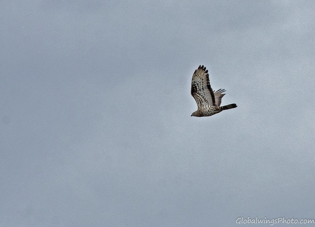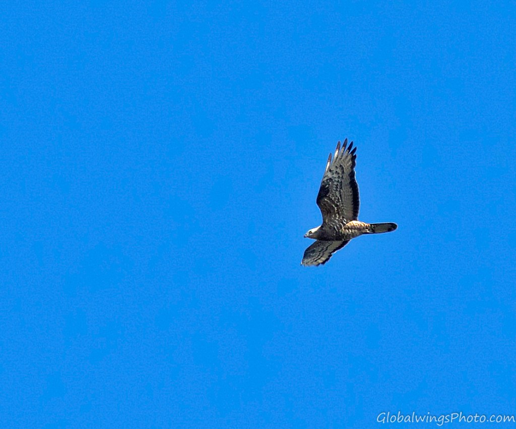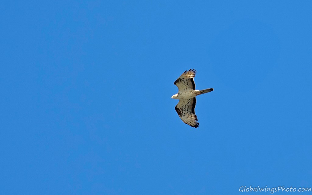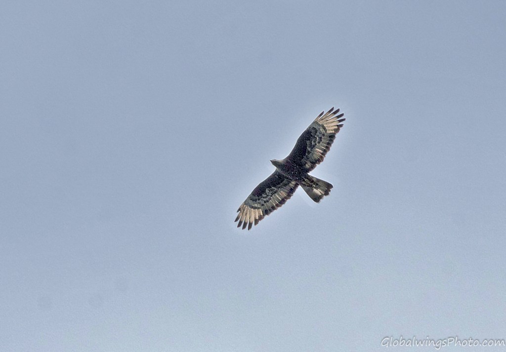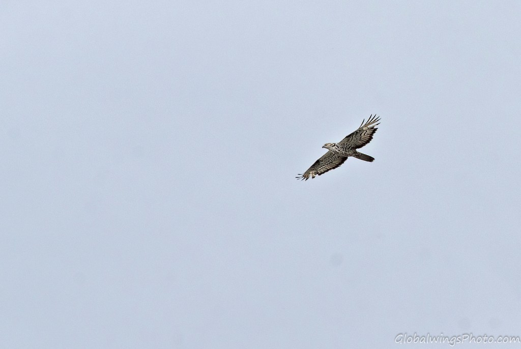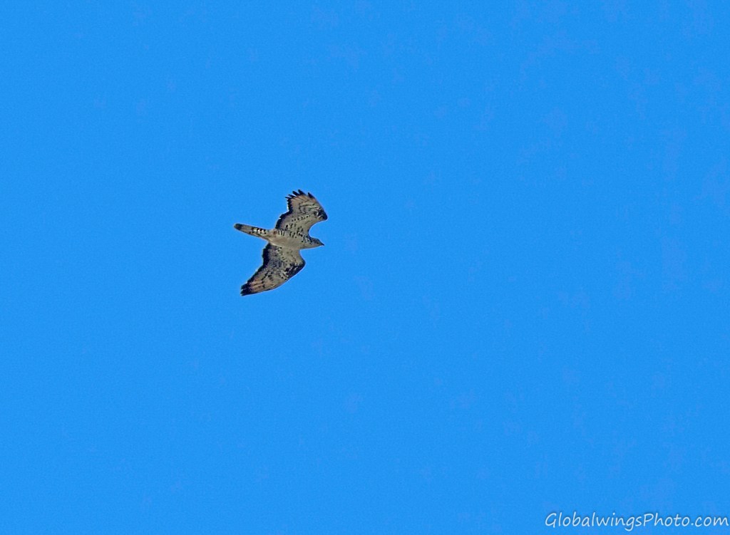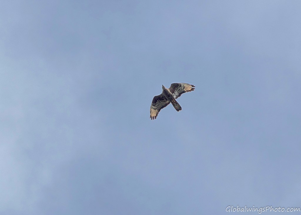 The dark form, on the other hand, has a dark body and secondary coverts (Photos 9-11). The intermediate morph is found in-between the dark and light forms, being mainly seen in that the secondary wing-coverts and body are barred. This is illustrated in Photo 12, where the intermediate morph flies below the dark morph. As also shown in Photo 13, the body and the lesser secondary coverts can have red-brown or brown barring on a pale bottom with a solid narrow band on the median coverts and a dotted band on the greater coverts. As also shown on Photo 14 and especially Photo 15, the wing coverts and body can be more heavily barred.
