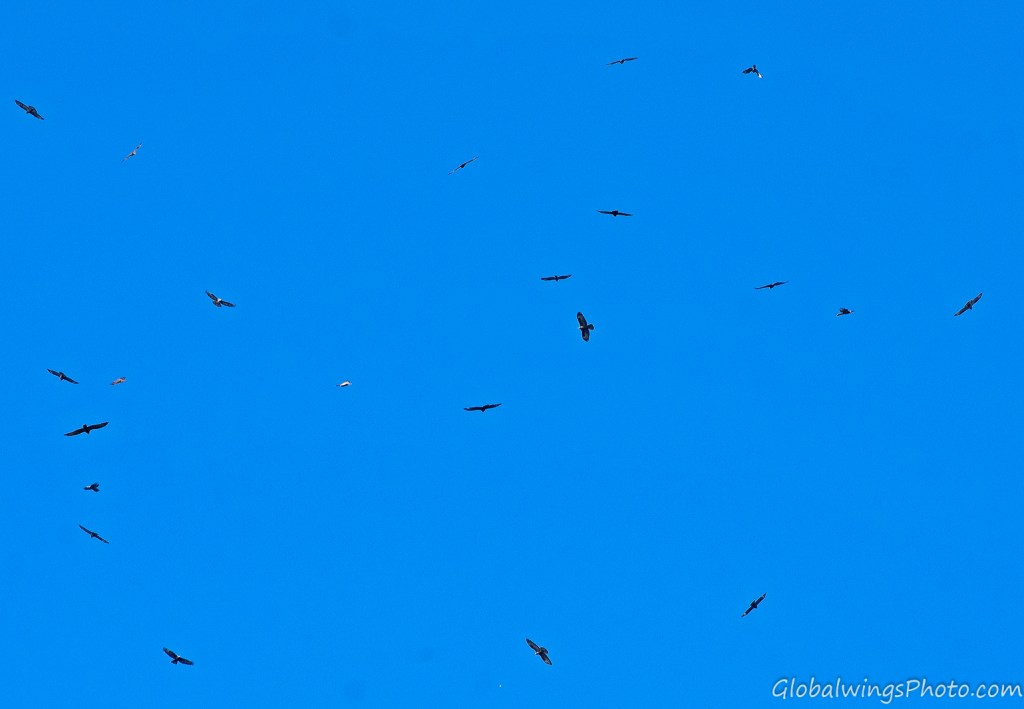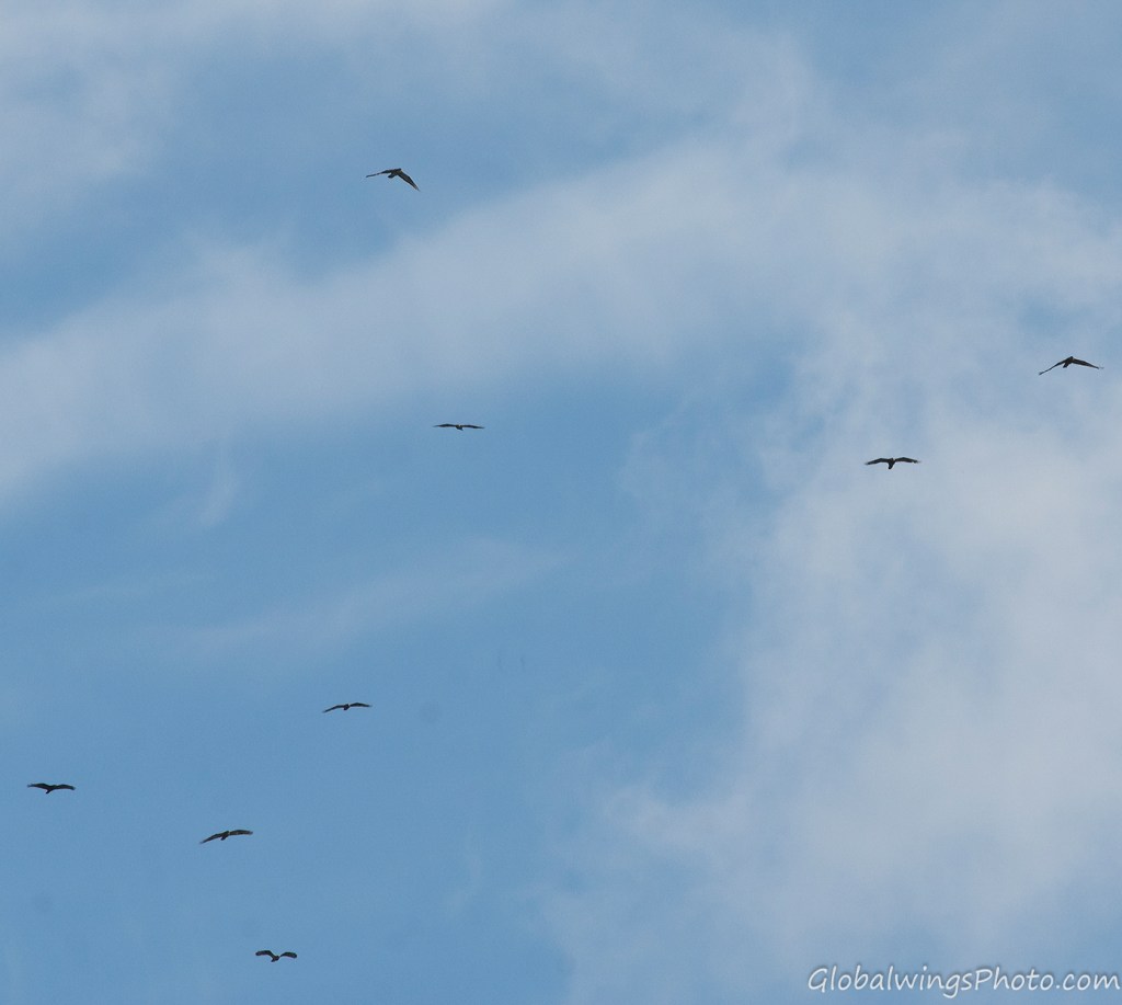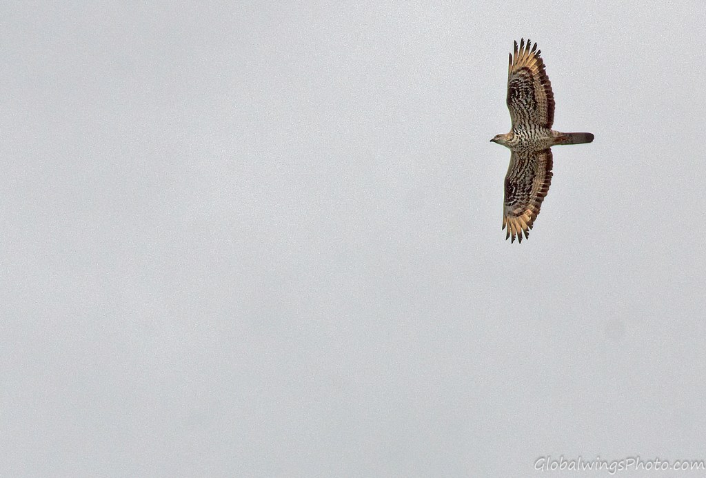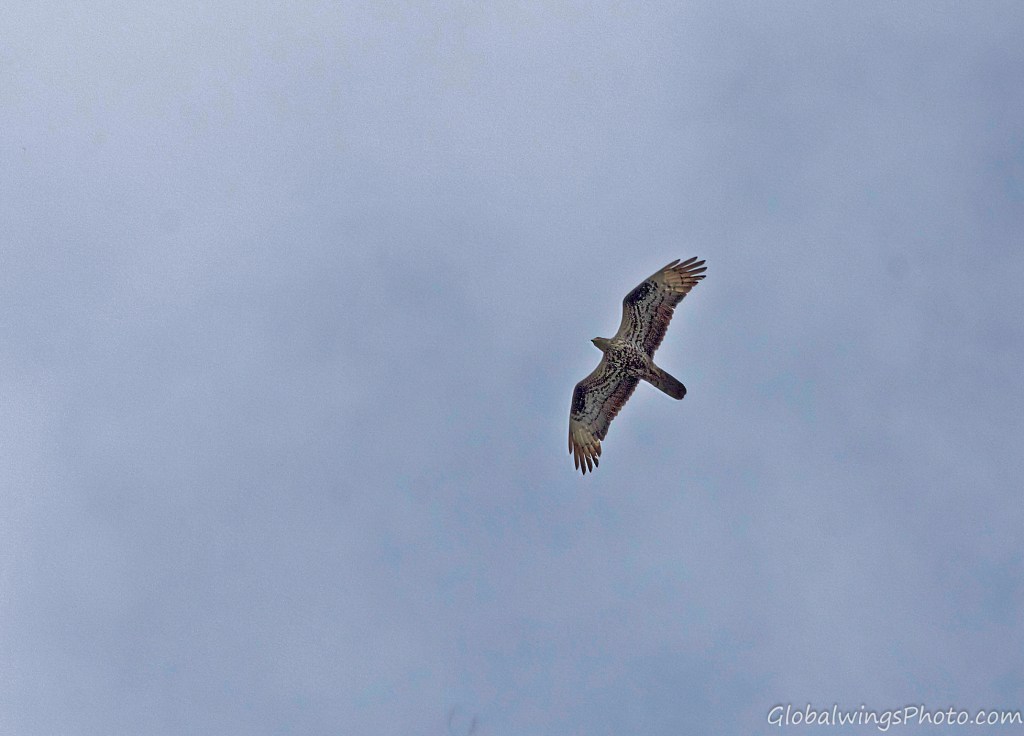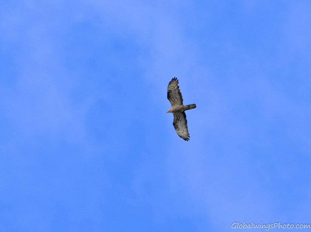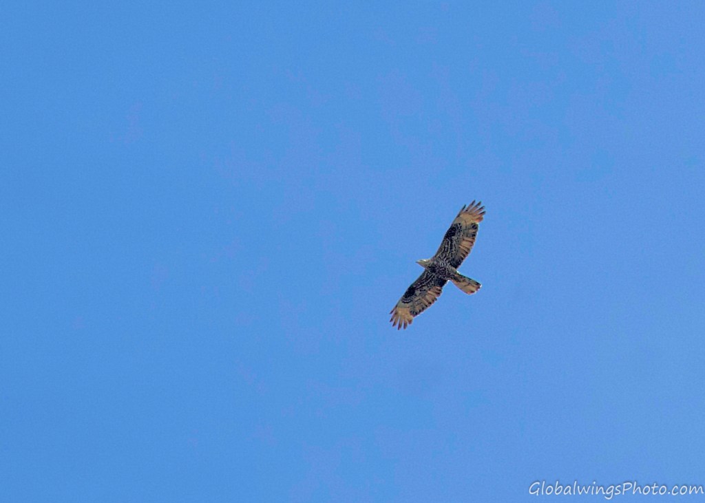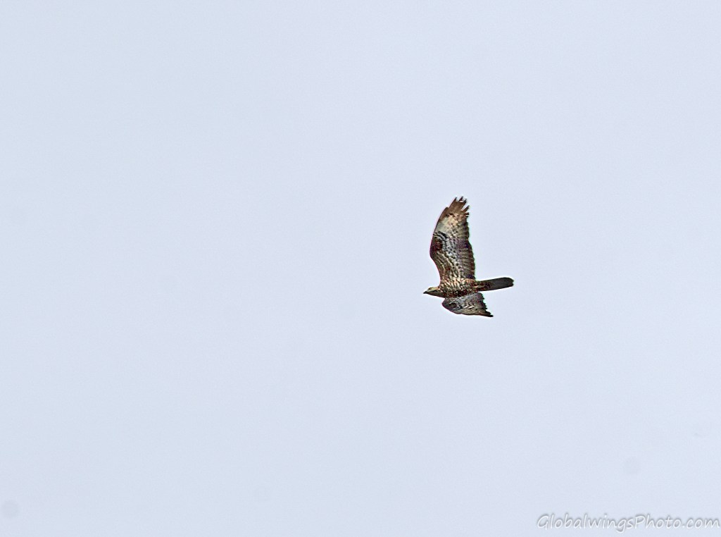 The dark form, on the other hand, has a dark body and secondary coverts (Photos 9-11). The intermediate morph is found in-between the dark and light forms, being mainly seen in that the secondary wing-coverts and body are barred. This is illustrated in Photo 12, where the intermediate morph flies below the dark morph. As also shown in Photo 13, the body and the lesser secondary coverts can have red-brown or brown barring on a pale bottom with a solid narrow band on the median coverts and a dotted band on the greater coverts. As also shown on Photo 14 and especially Photo 15, the wing coverts and body can be more heavily barred.